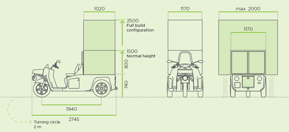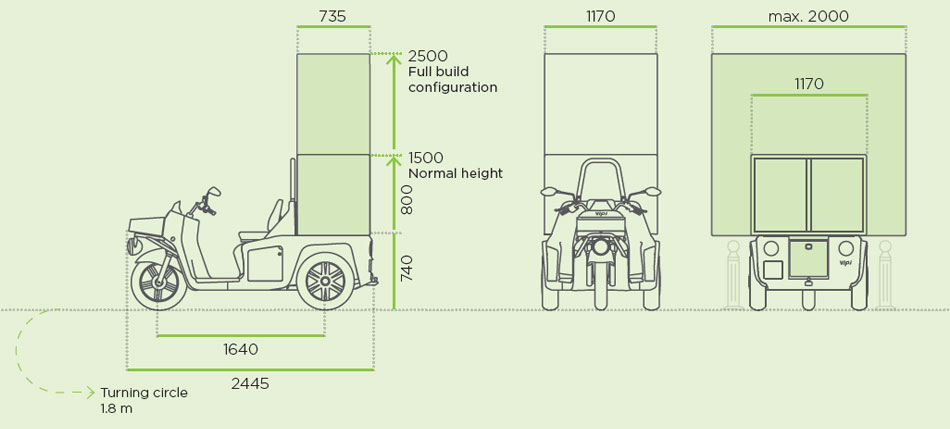 EFFICIENCY AND RESPONSIBILITY COMBINEDDriving through the narrow streets and avoiding traffic jams in the large cities is made easier with a dynamic delivery vehicle. Designed as a three-wheeler without doors VIPi allows for quick access on and off the vehicle and at the same time ensures the delivery efficiency with large cargo compartment. |