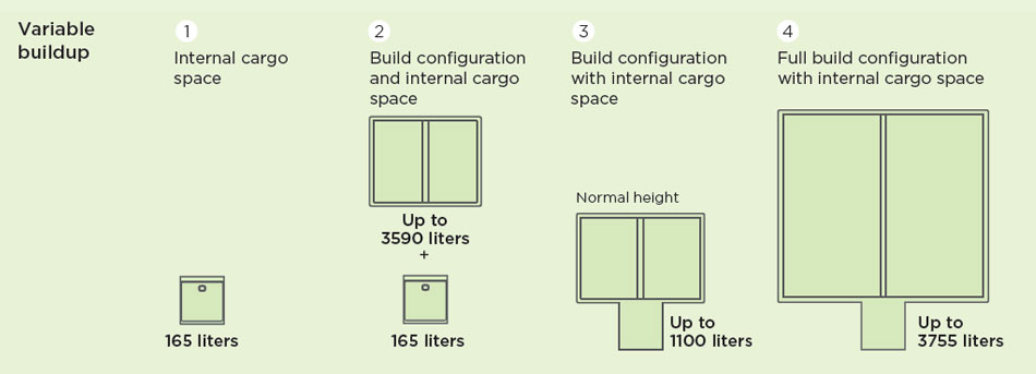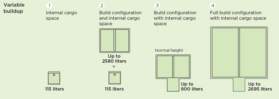 The flexible VIPi platform adapts to your varying needs every day. Whether you want to transport heavy cargo to or from your warehouse, take your operation center to a location in the city or deliver small packages in the inner city, modular platform enables easy modifications of this vehicle.