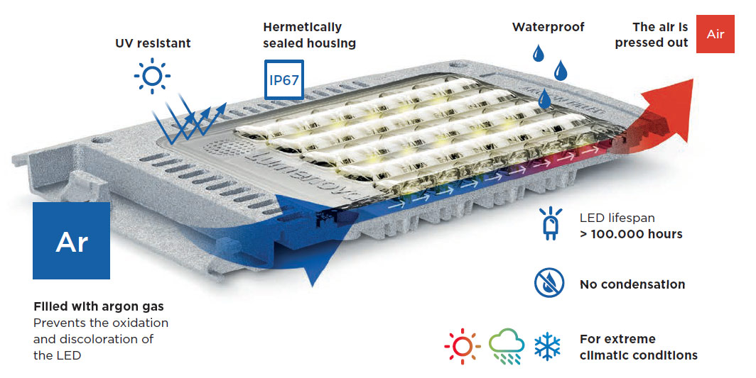 The hermetically sealed “Light Engine” is predestined for extreme weather conditions. The entire electronics of the LEDs are located in a room, filled with inert gas (argon), which protects them from ice formation in extreme cold. In heat, the module solution has several advantages; the additional, special filling with argon gives an even higher efficiency to the existing temperature management, which has a positive effect on the lifetime of the LEDs, and on the other hand, the sensitive electronics are optimally protected from dust and sand.
